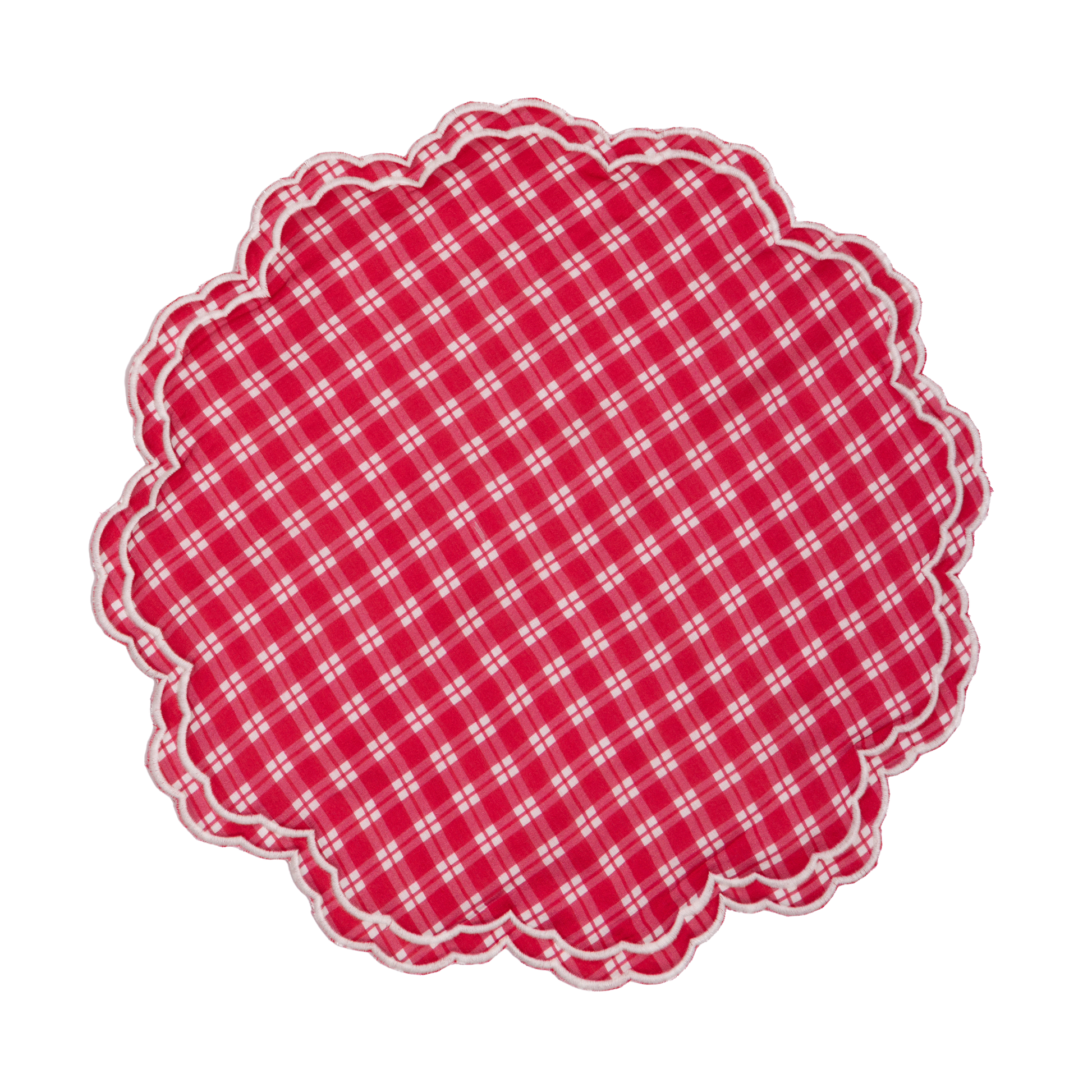 Where old-school charm meets a modern table crush — The Gingham Route is your ticket to a joyride in cherry red. Crafted from lustrous silk and dressed in a classic picnic-check print, it’s trimmed with a scalloped embroidered edge that’s all kinds of sweet. Think gingham, but make it glamorous — perfect for Sunday brunches, spritz-soaked lunches, and every tablescape detour in between.